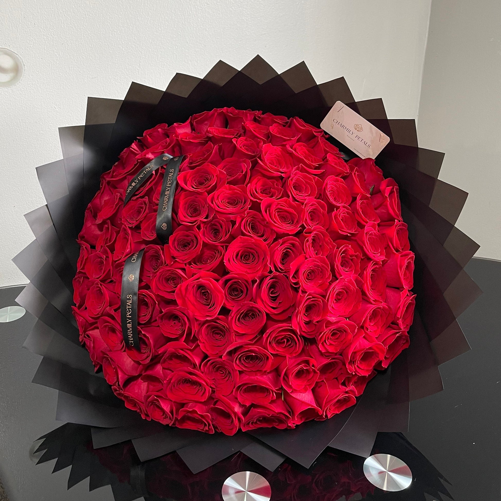 Elevate your Valentine’s gesture with a bouquet that speaks in the language of passion. Our Classic 100-Rose arrangement features one hundred premium red Ecuadorian roses, hand-crafted to create an unforgettable statement of love and devotion. Each rose is chosen for its deep colour, velvety texture, and extraordinary freshness. An unmistakable symbol of timeless romance.